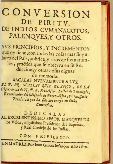 Matías Ruiz Blanco (Madrid, Juan García Infanzón, 1690) – Conversión en Píritu de indios cumanagotos y palenques, y otros (courtesy of John Carter Brown online library)