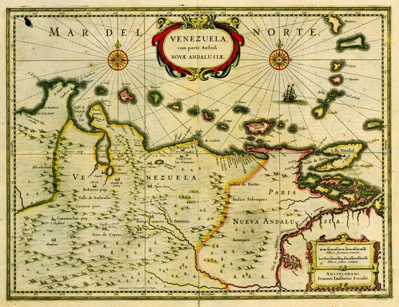 Johanes de Laet (Leiden, 1625) – Engraved map representing present-day North Eastern Venezuela territory with some Caribbean islands, which includes the mouth of the Orinoco river (courtesy of John Carter Brown online library)
