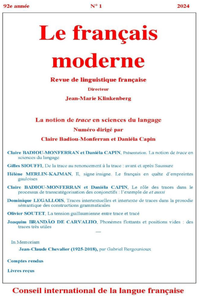 Le français moderne. 2024. La notion de trace en sciences du langage, dir par Claire Badiou-Monferran & Daniéla Capin. Paris: Conseil international de la langue française. ISSN :