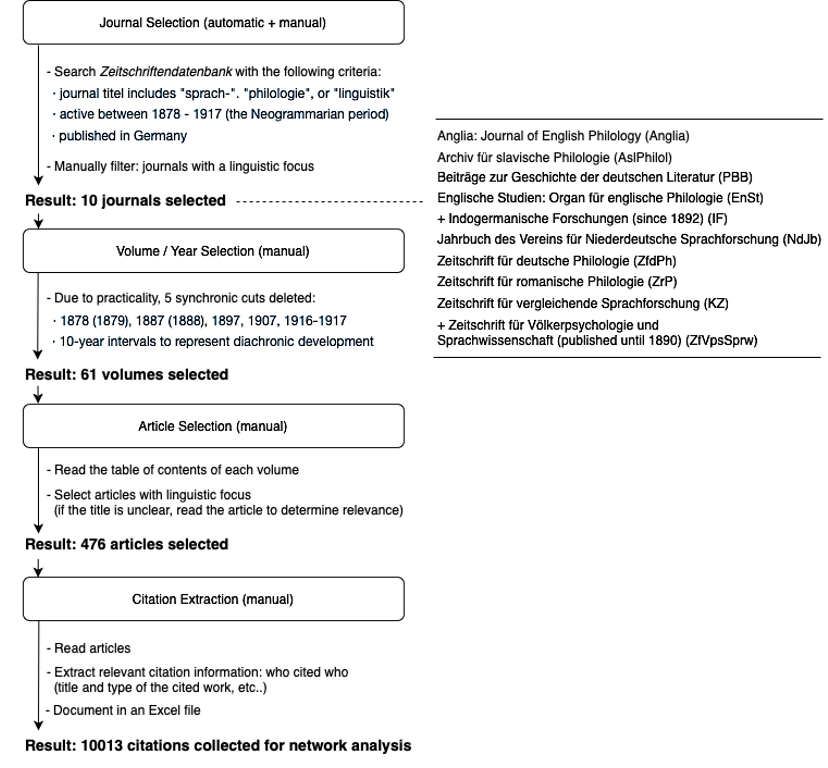 For the citation analysis, all citation data were collected manually. At the time, there were no standardized formats for citations in academic publications – neither in terms of quality nor form – which applied to journal articles as well. As a result, it was not possible to extract citation information automatically. The data collection process was therefore carried out primarily by hand, as outlined below in Figure 1.