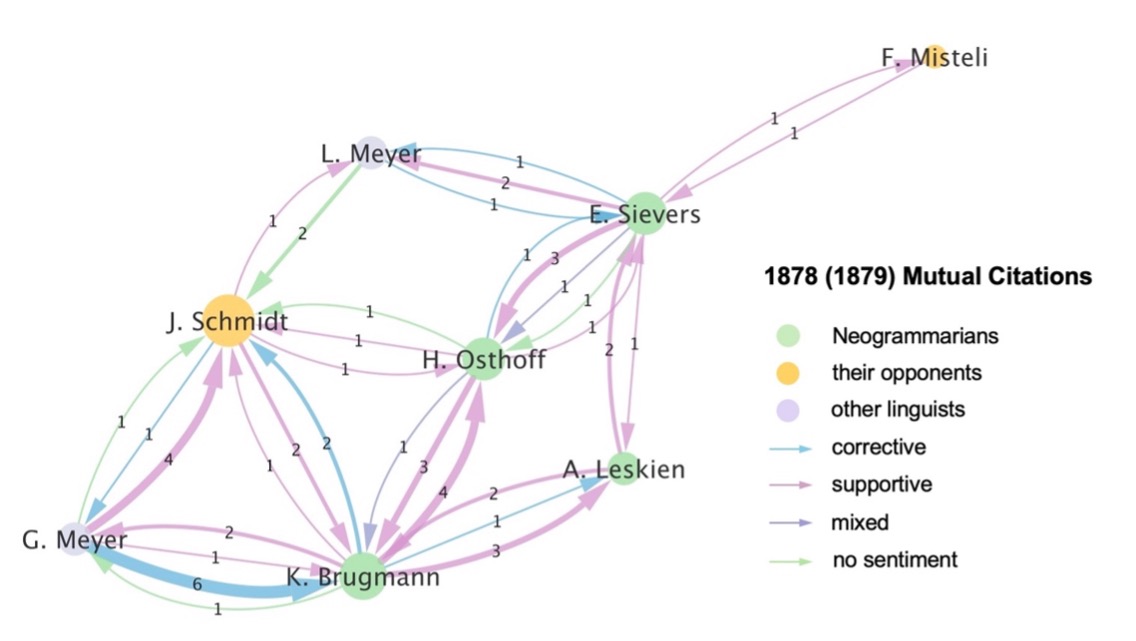 Even within the Neogrammarian School, there were instances of negative citation sentiment (shown in blue and purple arrows), reflecting internal debates and intellectual disagreements. These divergences contributed to the dynamic evolution of the Neogrammarian language theory. While critical self-citations – for instance, by Karl Brugmann (1849–1919) (1879: 92) and Hermann Paul (1846–1921) (1879: 216–217) – also played a role in this development, my dissertation project focuses primarily on the interpersonal scholarly relationships.