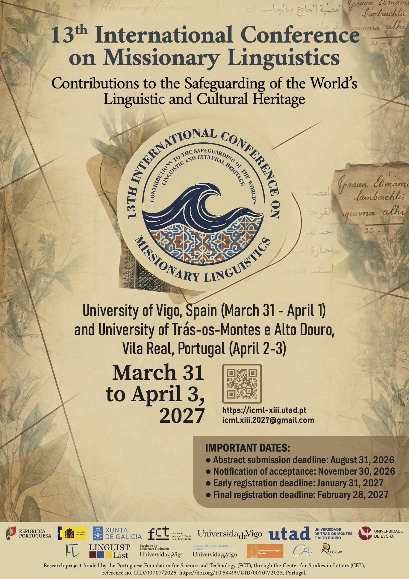 The Organizing Committee of the 13th International Conference on Missionary Linguistics invites the academic community to submit proposals for individual papers, thematic panels, and posters for the 2027 edition, jointly organized by the Faculty of Philology and Translation of the University of Vigo and the Center for Studies in Letters (CEL), based at the University of Trás-os-Montes e Alto Douro in Vila Real.