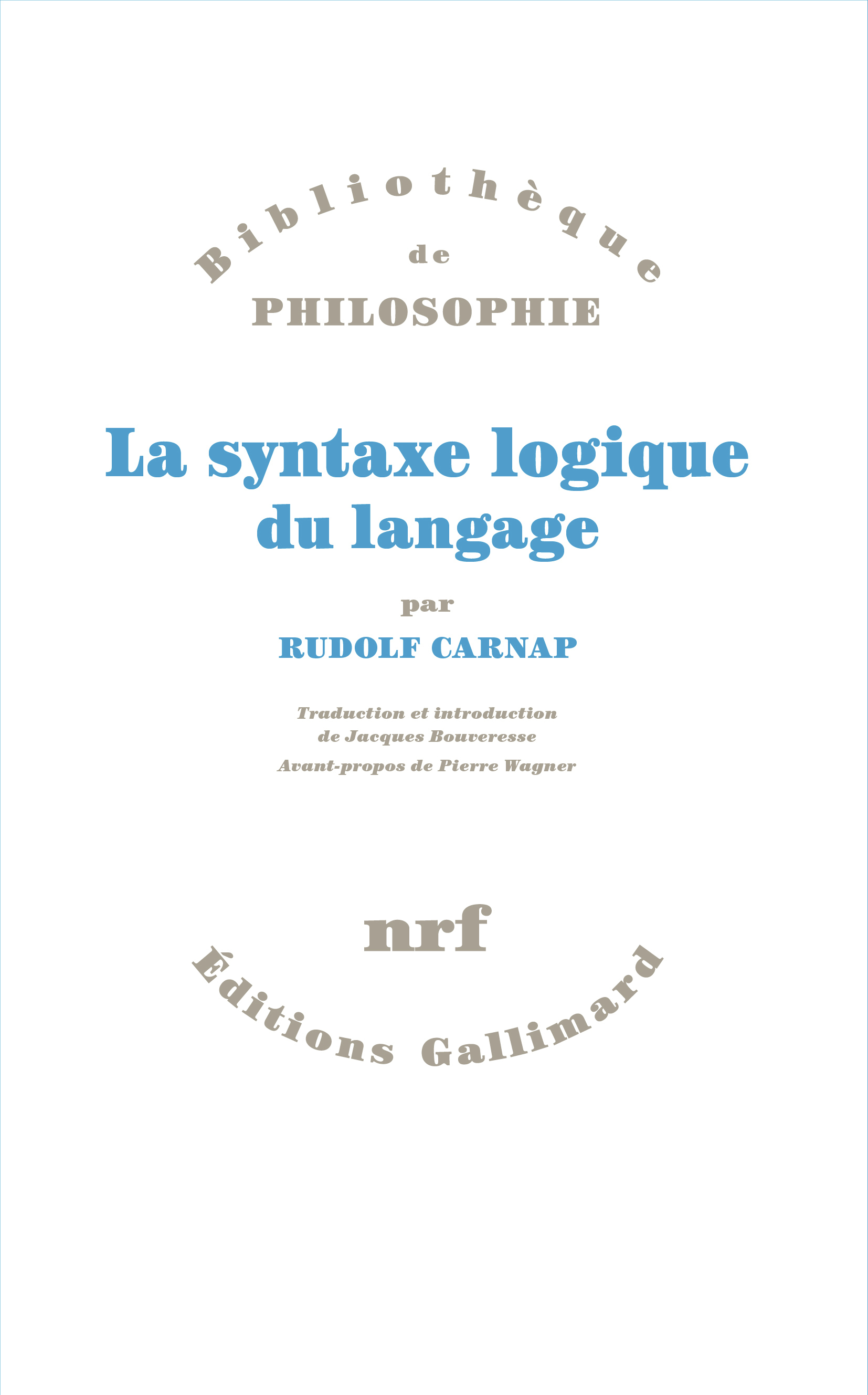 Carnap, Rudolf. 2026 [1937]. La syntaxe logique du langage. Traduction et préface de J. Bouveresse. Note liminaire et établissement du texte par Pierre Wagner. Avec la collaboration de Baptiste Mélès. Paris: Gallimard (Bibliothèque de philosophie). 496 p. ISBN 9782070772421